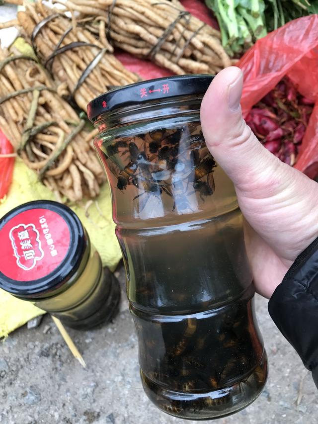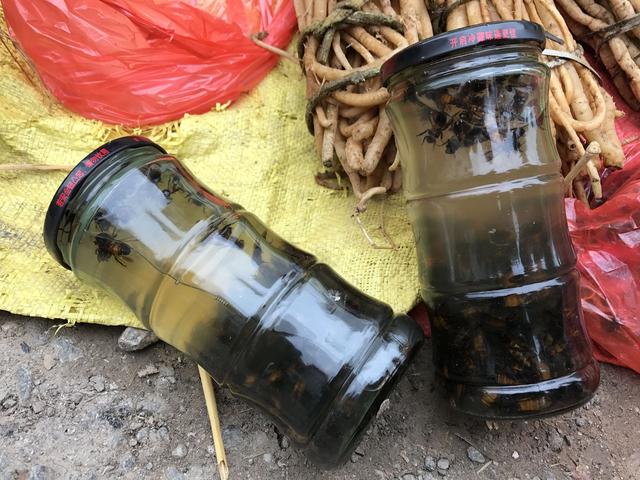 农村大妈说这两瓶是“蜂子酒”,是从山上抓的野马蜂,还在鲜活的时候就浸泡到装有自制土酒的瓶子里。