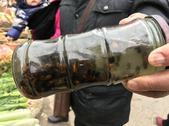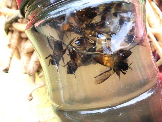 仔细看这两瓶液体,里面浸泡着许多死的成年马蜂。