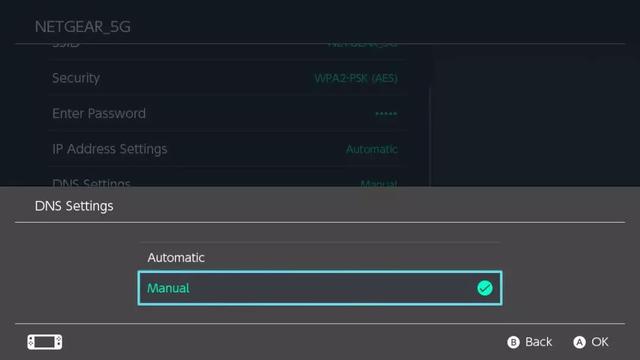 4.进入DNS选项后更改设置为Manual,确认后返回上一部菜单;