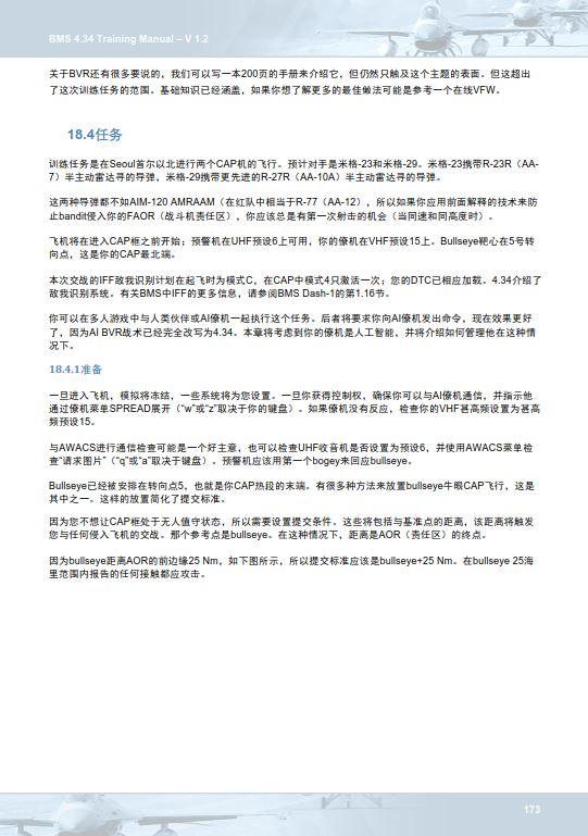 18.4.2管理AI僚机在进入CAP之前,一个关于管理AI僚机的小词。在4机多人飞行中,一个CAP通常是用反向旋转的元素来完成的;一个小队是热的,另一种是冷的。各机协调各自的转弯,以便始终有一组雷达在主要威胁方向扫描AOR。各机相互覆盖;当一个元素变冷时,热机接管了交战的责任,也就是“Grinder研磨机”,并在冷机重置时与敌人交战。有了AI人工智能,要做到这一点就有点困难了。在使用人工智能的两机场景中,最好让你的僚机保持分散,并与你站在同一段上。有关管理AI的更多信息,请参阅Docs文件夹中BMS COMMS和NAV手册的第2.1.2章。你的僚机的默认状态是“weapons tight武器紧绷”。但他会比你更快地参与,因为他不在乎承诺的标准;所以你一定要把他拴紧。当僚机向你请求“permission to engage允许交战”时,你必须回应这个呼叫。如果你没有回应,过一段时间就会被视为默许。所以,如果你不回应,你的AI僚机就会发动攻击。如果触点距离太远,请从僚机菜单中选择“Weapons Hold武器保持”,让你的僚机等待。准备好经常用那个。发出“Attack Targets攻击目标”命令时的默认排序是:lead排序lead,wingman排序wingman。使用“Weapons Free无武器”命令指示僚机自己四处寻找目标,因此没有分类和导弹溢出的可能性。或者你可以把你的光标放在所需的接触,并指示你的僚机'Attack my target攻击我的目标';然后获得你自己的目标并与之交战。你这样做会浪费宝贵的时间。在我看来,最好的做法是使用“攻击目标”命令,并相应地进行排序。但要记住,人工智能没有你聪明;在整理你的目标之前,一定要(用IDM)仔细检查你的僚机正在跟踪哪个目标,以确保你不会浪费宝贵的导弹在解除交战后,一定要指示你的僚机“Rejoin Formation重新加入编队”,否则他会去追MIG米格。在较低的技能水平下,人工智能可能会在一架米格-23战机上发射最多4个slammer砰击机,所以要时刻注意他们在做什么,不要让他们摆脱束缚。如果你想监视与你的AI僚机的距离,你需要根据AI默认使用的A/A TACAN塔康设置你的A/A塔康。AI机总是使用相同的结构:•机组第一次飞行:导线:12Y-僚机#2:22Y-元件导线:75Y-僚机#4:85Y•机组第二次飞行:导线:13Y-僚机#2:23Y-元件导线:76Y-僚机#4:86Y使用同一格式最多可支持5个飞机。这次训练任务是第一次飞行,所以你的僚机的A/A塔康是22Y。与他配对设置85Y(22+63)。启动IDM CONT确保你能追踪你的僚机的位置和目标。作为提醒,按FCR上的OSB6直到读到CONT,然后用一个长COMM开关左,启动IDM循环。