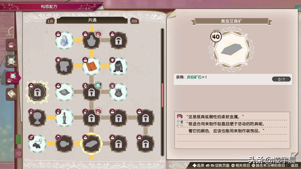 游戏中除了上述所说,其实还有炼金解锁方面的问题。玩家一开始的炼金等级确实比较高,初始50级的炼金等级,在其他游戏中几乎可以制作绝大多数物品了。而本作却是由于是在梦境的世界,与之前世界的素材均不相同,所以配方自然要重新学起。通过包括不限于采集、打怪、剧情等形式的发展,玩家可以解锁很多配方,具体要求在配方菜单中对应的位置均有提示。而角色方面除了等级上升,也会随着探索与提升等级,增加角色的CP值。个人建议前期CP值用在采集相关的方向,之后再强化角色的输出防御能力更为合适。毕竟强化角色带来的质变,还是比不过炼金物品带来的大。