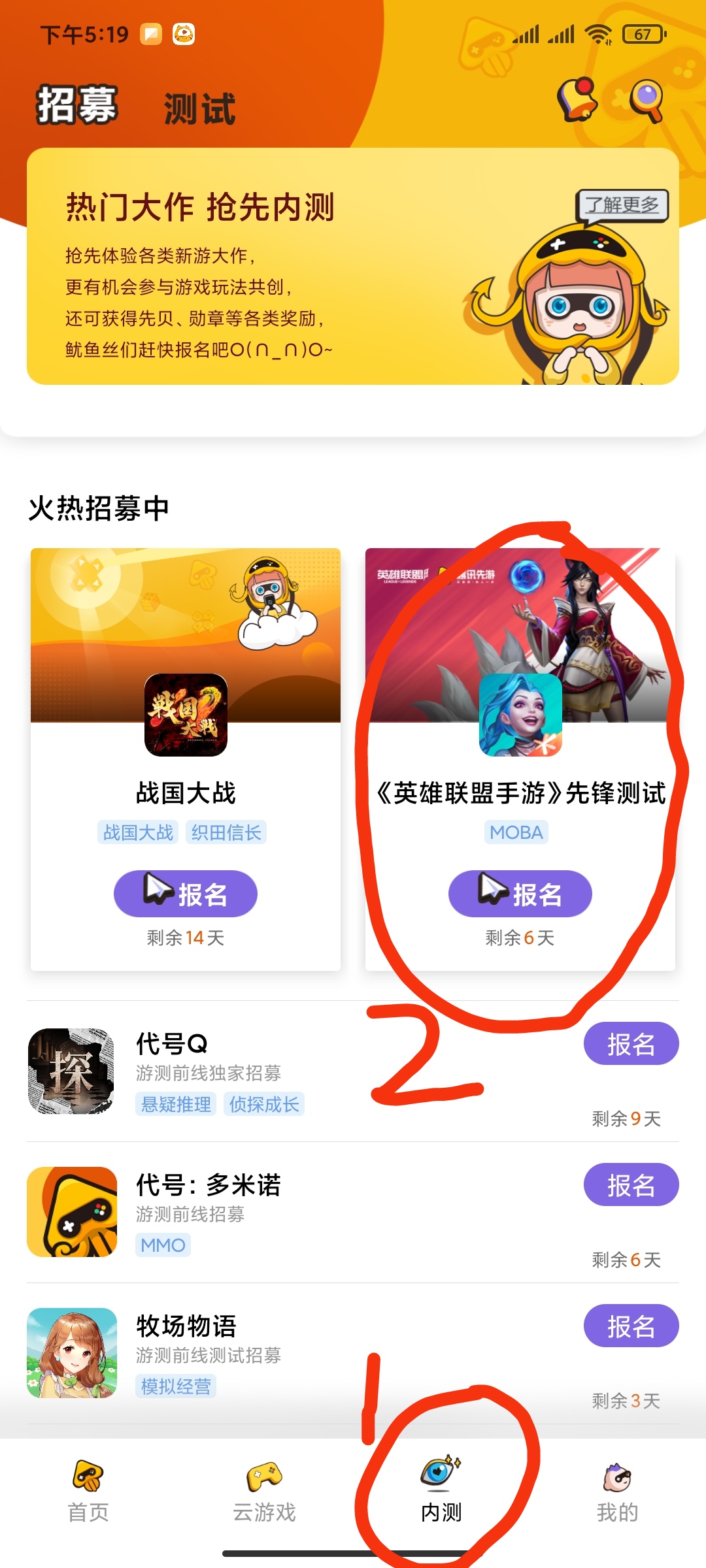 第二步 申请内测 进入先游,点击内测,找到英雄联盟手游,填写内测问卷。