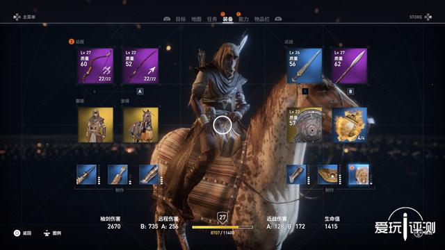 正如大多数ARPG一样,“起源”非常重视人物和装备的面板数值,即便是巴耶克的三大天赋树,到终极阶段仍是强调伤害百分比的增加;防具是一个固定的变量,随着玩家收集材料升级后,人物的四围会越来越丰满;武器是一个随机的变量,也是类黑暗ARPG的标配,本作中2弓2近战1盾1袖剑(可随意切换)的搭配,金色/紫色/蓝色的武器品质设定,一些诸如中毒、出血、燃烧和各类抗性的附带效果,甚至让人担心刺客信条以后会不会变成一个纯正的RPG。但是如果抛开对这个系列的固有印象,我并不抗拒这样的设计。