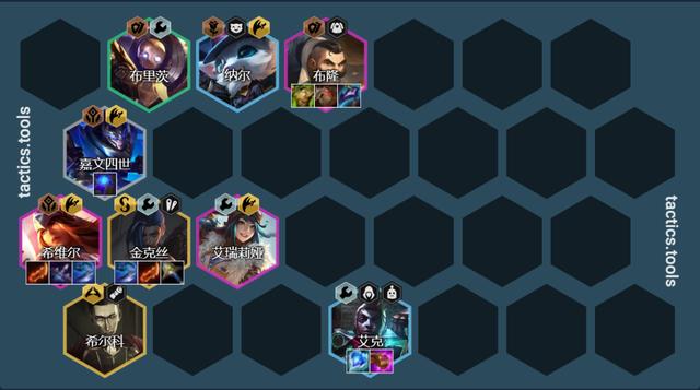 阵容组成:希维尔、嘉文四世、布里茨、纳尔、艾克、布隆、艾瑞莉娅、金克丝、希尔科(9人口)