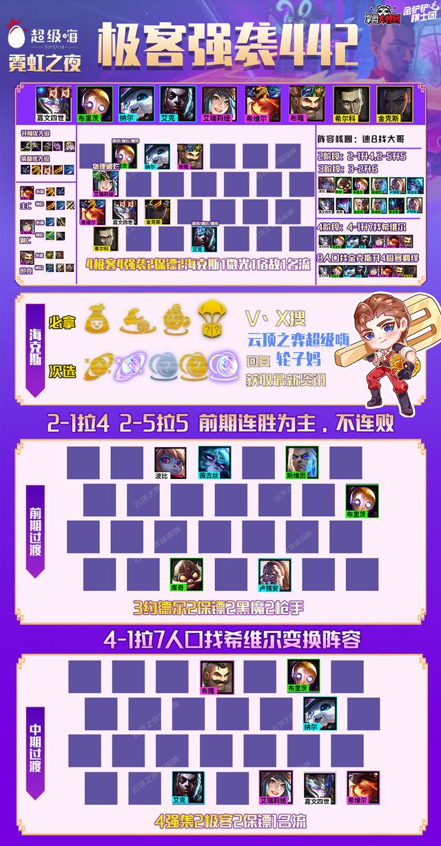 阵容羁绊:4极客4强袭2保镖2海克斯1微光1宿敌1名流