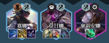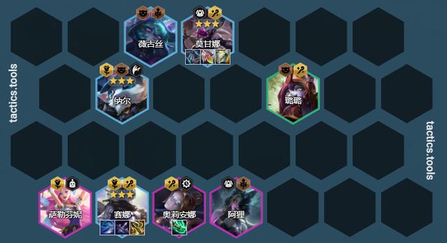 阵容组成:璐璐、薇古丝、莫甘娜、纳尔、萨勒芬妮、奥利安娜、阿狸、赛娜