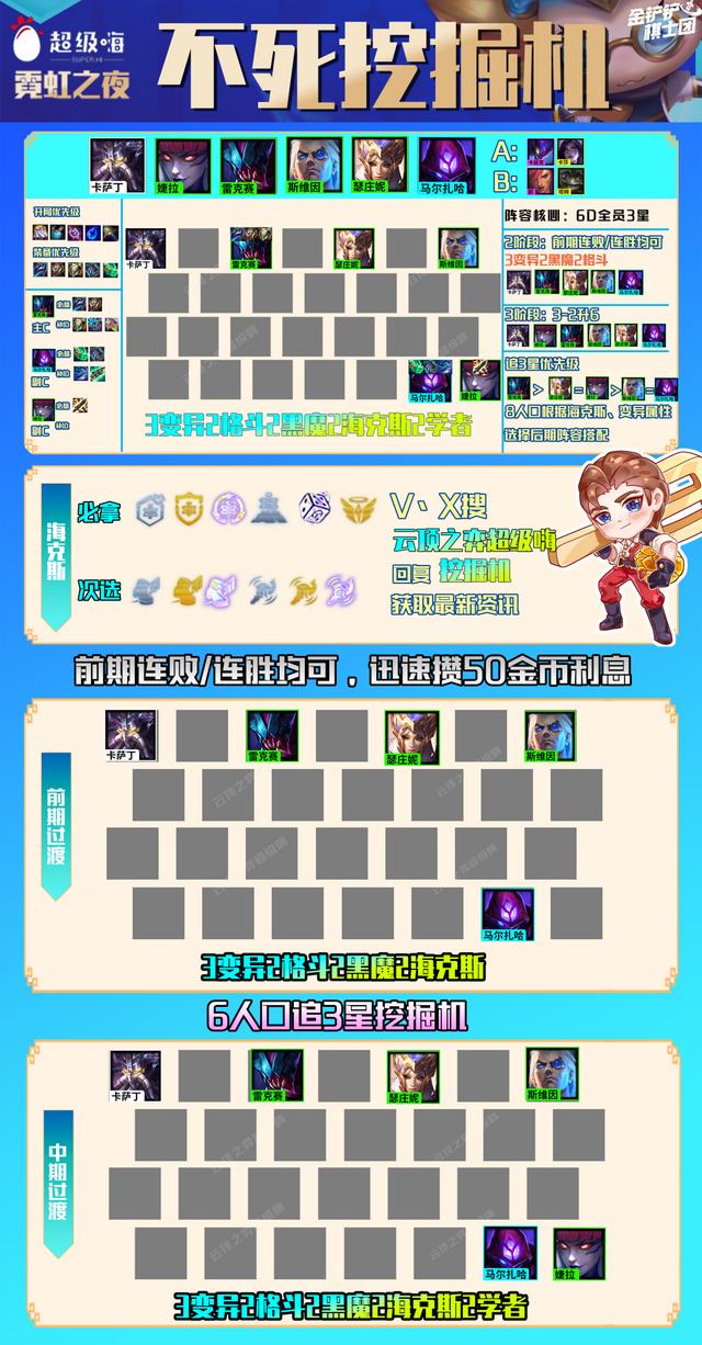 阵容运营:这是一套以2费卡为核心的赌狗阵容,前期无论是连胜还是连败都可以。因为阵容核心是利用3星雷克塞在中期的强度血入火男和黑魔枪阵容。因此主C雷克塞的质量就非常关键,这里只建议开局有魔抗才去玩,没有龙牙雷克塞是顶不住对面的伤害的。
