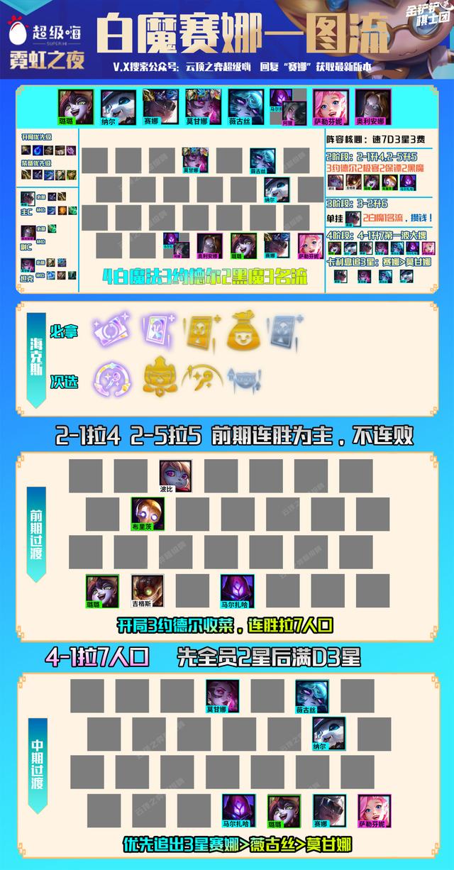 阵容运营:这套阵容7人口就初步成型,刚好7人口搜三费卡比较好搜,前期拉人口走连胜,最好是用约德尔人过度,这样经济也有保障,3阶段升6人口,搜二星赛娜二星莫甘娜,其他牌质量够就可以升7,7人口看情况追三星C位,如果血量经济好就直接拉8人口,如果锁不住就在7人口追三星。