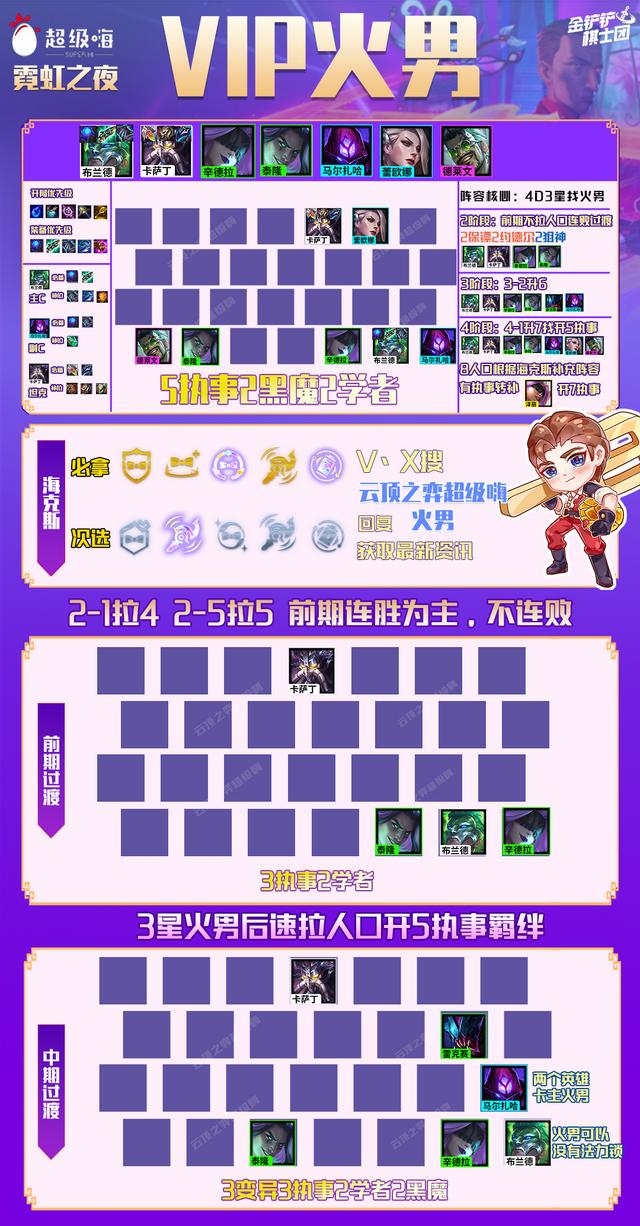 运营思路:这是一套速8速9的阵容。因此连胜就非常重要,2-1拉4人口,2-5拉5人口,3-1拉6人口,如果可以的话3-7直接拉7人口,连胜拉人口打连胜。