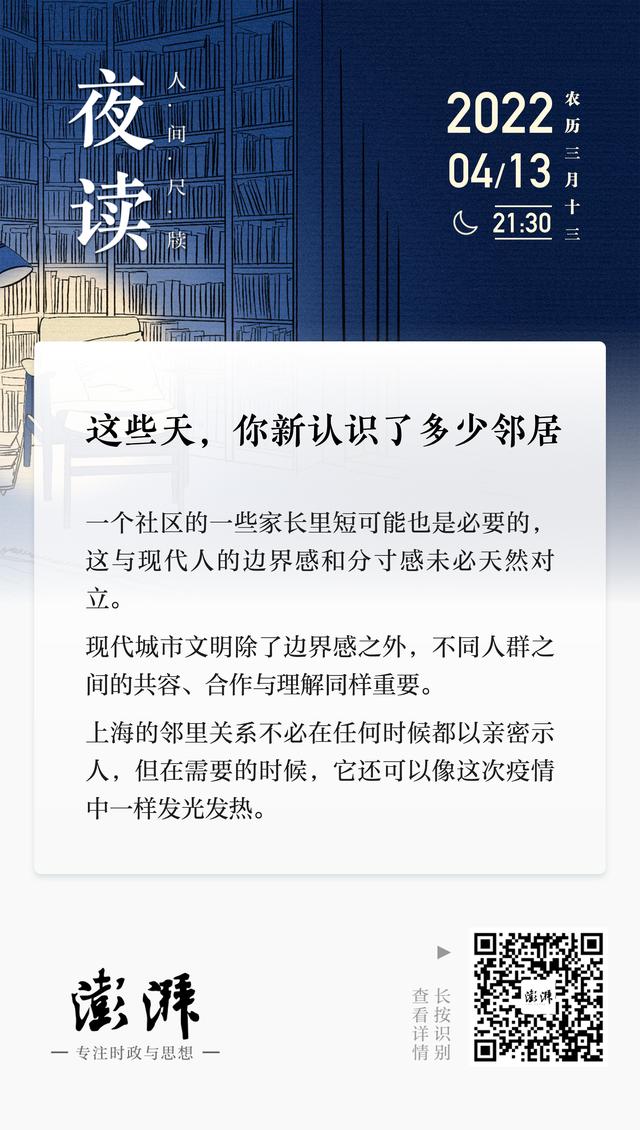 现代城市文明、宅文化、邻里关系,并非如我们之前所想的那样互不相容,人情味也未必是前现代社会的“遗存”,这次经历告诉我们,人与人之间、邻居之间可以有一个新的连接可能性。这种可能性既不是前现代整日家长里短的“熟人社会”,也不是所谓的冷漠现代都市。