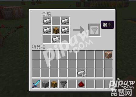 漏斗的合成表如下图,小伙伴们可以在合成栏中很方便地合成出来,我们需要准备一些铁锭和一个箱子,箱子可以用任何品种的8个木板合成: