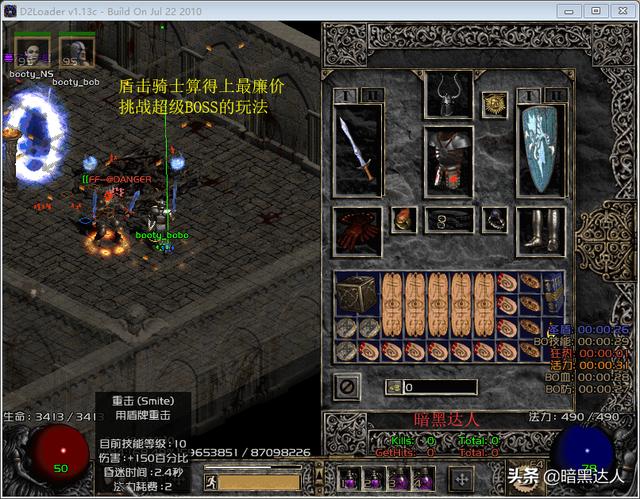 无论是超级6BOSS还是世界事件的超级暗黑破坏神,除等级较高外还具有大量的生命值和极高的回血速度,且攻击力也很高和多样化。圣骑士盾击(重击)的特点就是能100%命中,再利用装备中带有的压碎性打击(按当前生命比例掉血)、撕裂伤口(效果持续期间防止回血)、吸血诅咒(装备中带有的吸血属性对盾击无效,只能依靠触发吸血诅咒后回血)能轻松击杀这些BOSS。抗性和血量尽量堆高一些,最好搭配个呐喊系辅助野蛮人,包包里也带满各种抗性和生命护身符。