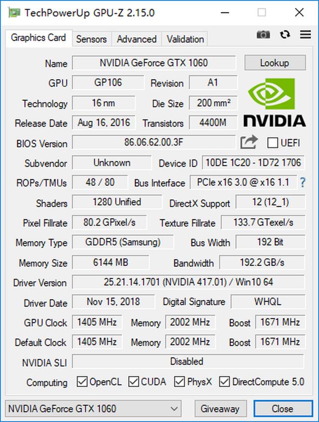 独立显卡方面依旧是万能甜品级显卡NVIDIA GTX 1060 6GB满血版,基于NVIDIA Pascal架构设计,16nm工艺,1280个CUDA核心,核心频率1405MHz,显存位宽192Bit,显存颗粒采用三星的GDDR5颗粒,具备一定的超频潜质。这样一款显卡在如今N卡20系全面到来的情况下依旧能够在市场上占据很大的比重,与其强劲的性能和甜品级的定价是密不可分的。在不做其他操作的前提下,这张显卡已经足够应对市面上所有主流游戏的需求了。