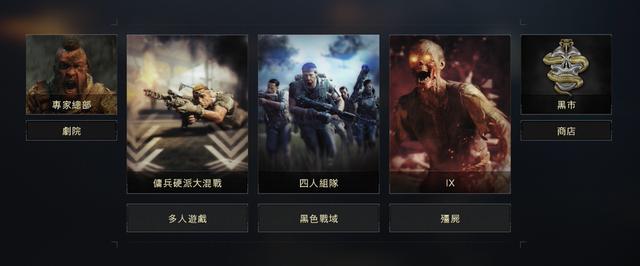 初进游戏,在一段简单的游戏开发商和发行商的CG过后,就可以开始操作了,首先映入眼帘的就是这样一个简单的操作界面,中间的三列代表的是目前游戏的三个主要玩法:多人对抗,黑色战域(大逃杀模式)和自《使命召唤》7代以来就备受玩家喜爱的“丧尸”模式。