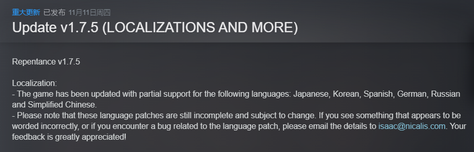 Steam平台《以撒的结合:重生》于今日(11月11日)发布了v1.7.5版本的更新,官方简体中文正式推出。此外,官方还表示该语言补丁尚不完善,如果玩家发现一些措辞方面的错误,可以将其反馈至官方邮件中。