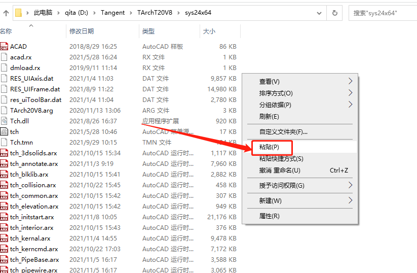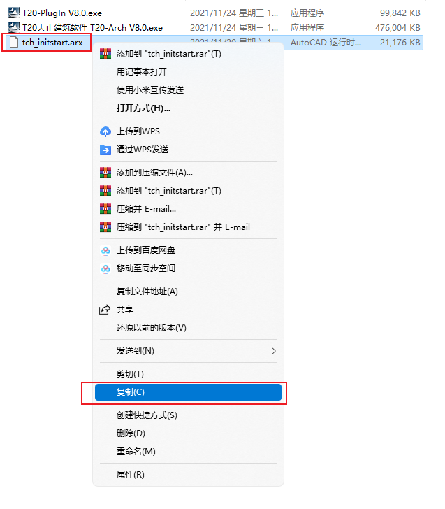 继续返回到解压的【天正建筑T20 V8.0】文件夹中,然后鼠标右击【tch_initstart.arx】文件选择【复制】。