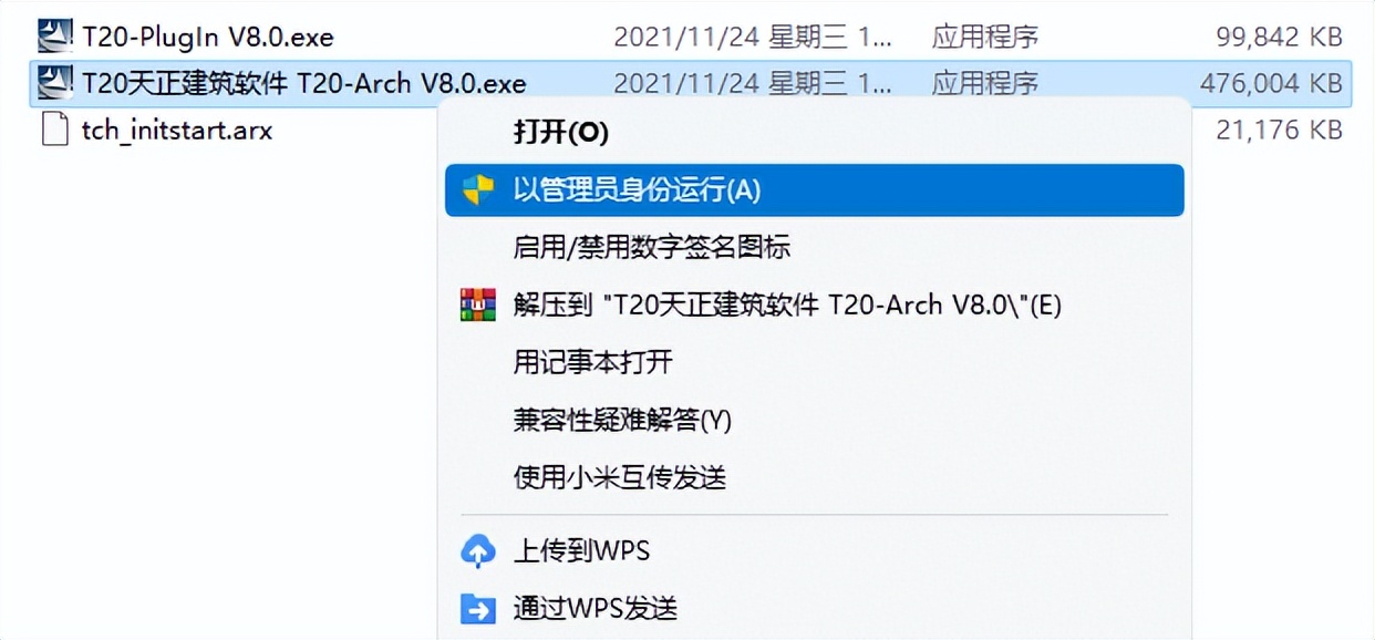 右击【T20天正建筑软件 T20-Arch V8.0】,选择【以管理员身份运行】