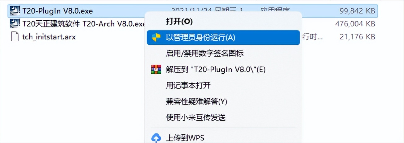 返回到解压的【天正建筑T20 V8.0】文件夹中,然后鼠标右击【T20-PlugIn V8.0】插件,选择【以管理员身份运行】。