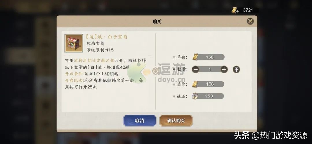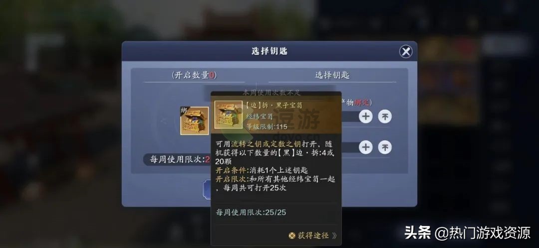 2.开启方式:开经纬箱子的钥匙和开琅纹的钥匙是同一种,每周使用上限25把,和琅纹分开计算。在大帮会随着钥匙的需求增多,分红又多了一些。