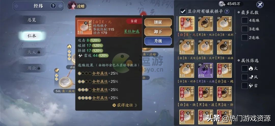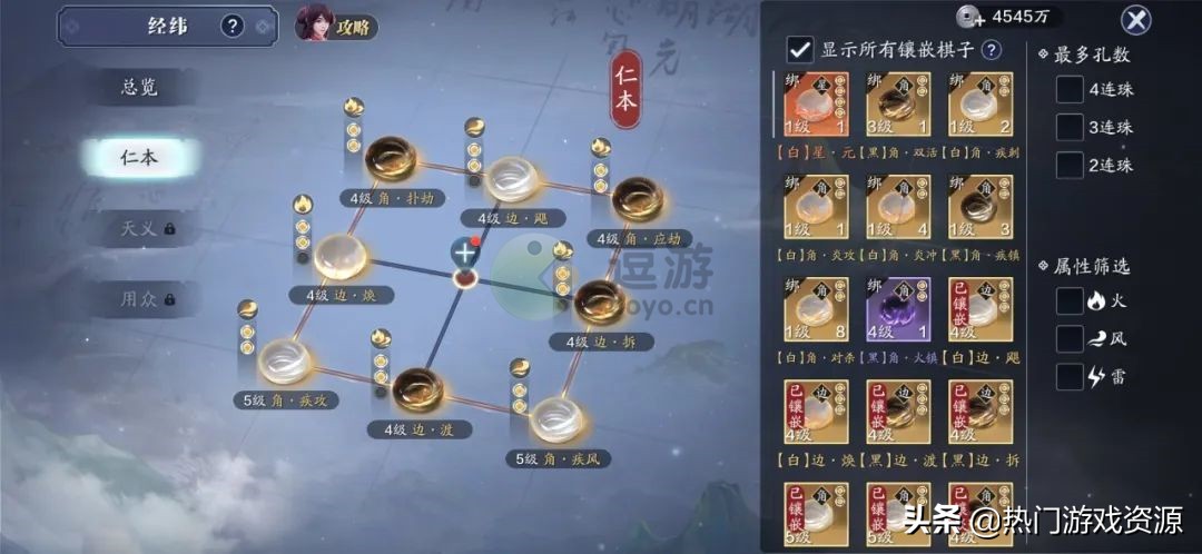 7.连珠规则:中间星位槽可以连接4个棋子插入镇派棋子可最多激活4条连珠效果(没有的话就放点券棋子)。4条边可以连接3个棋子,插入点券棋子(名称都是边·XX)可发挥最大作用。4个角只能连接2个棋子,所以插入普通金色棋子(名称都是角·XX)即可拉满属性。