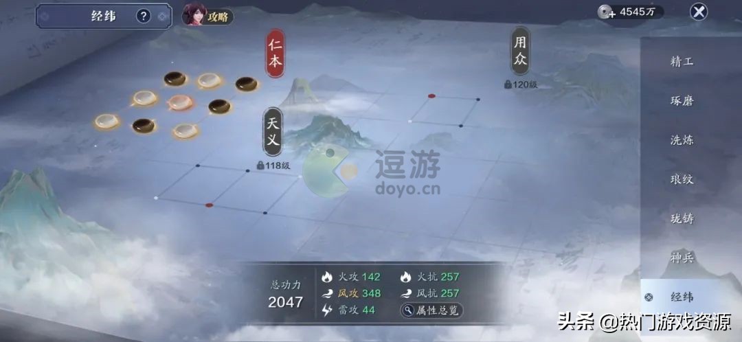 1.棋盘数量:经纬系统一共3个棋盘,115开启第一棋盘仁本,118开启(下周六)第二个棋盘天义(但只开放4个槽位),120级开启第三个棋盘用众。每个棋盘有9个孔位可供插入棋子,但这个版本天义和用众大概率不会开启全部槽位,所以我猜测这个版本大概只要准备18个棋子。