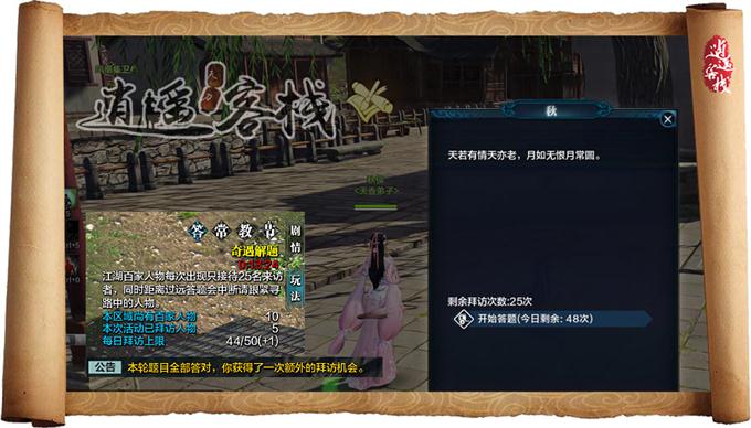 此时区域内会有10个NPC等待被玩家拜访,他们分别藏在圈圈区域内的各种犄角旮旯。每个NPC可以被玩家拜访25次。而玩家每天可以拜访的上限为50次即5轮奇遇答题。当达到拜访上限人数时,NPC将不能再接受拜访哦。当然偶尔运气好,答题后还会获得额外的拜访机会