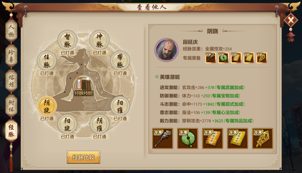 百步穿杨神技之一增加100%命中,乔峰指点下有武当游刃有余的感觉,刷新了输出技能的冷却,可以打够两轮伤害,这里推荐乔峰,为什么?两轮技能伤害的收益要高于慕容复15%会心的提升,尤其到了后期,宝石经脉附体的加成上去之后,会心不会低,某种意义上来讲不差15%。