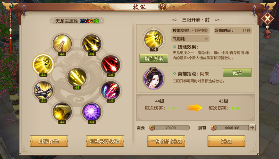 一阳指主要输出技能之一,阿紫指点7米外目标伤害提高30%,拉锯战里无二之选。三阳开泰在这里推荐阿朱,对目标散功,这一点克制近战爆发类职业,诸如明教少侠,天山少侠这类,原本天龙防御就不够,三阳的散功算是一种强力的保护。