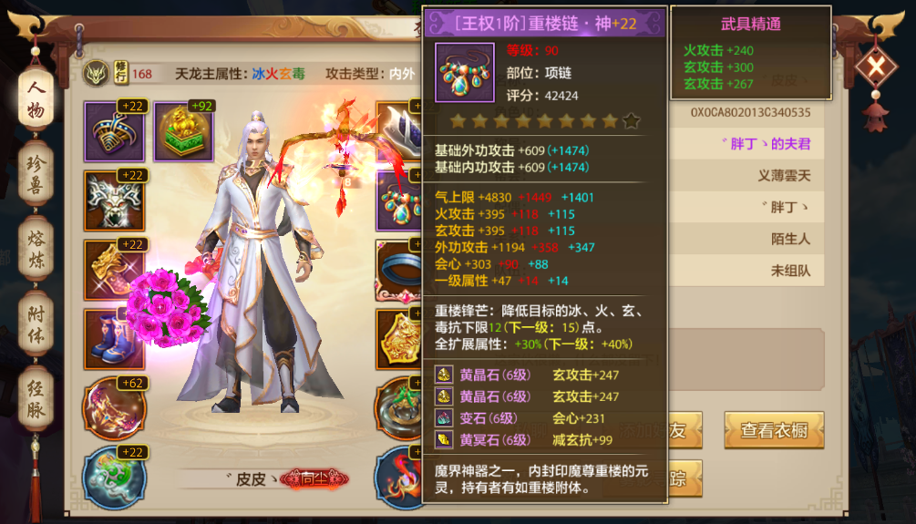 经脉建议就可以全属攻带命中,原因很简单,本来输出就不够,全属攻是必须的。命中无需多言,天龙能否在PK场里打出很好的效果,控制技能的命中率相当关键。龙元选择和装备宝石异曲同工之妙,天龙定位输出控制,那么简单的攻击龙元就必不可少,本身的缺点防御差,血上限提高也要有补充。