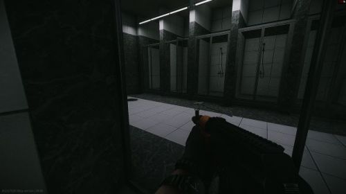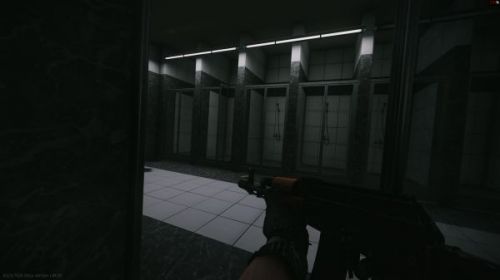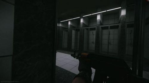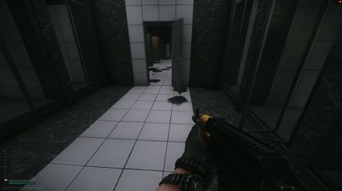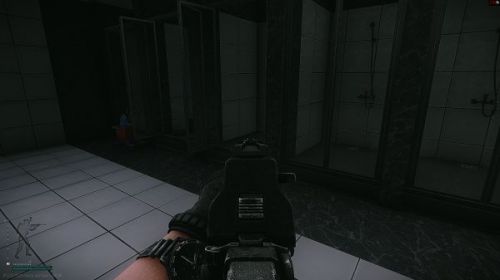 4、按住向右侧探身开枪的键子(默认是哪个我忘了,我设的z),向左移动枪口直到枪口靠近黄色拖把头左侧第二排地砖(我这里用的ak,别的枪可能略有差别)。