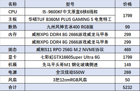 这里我推荐CPU用intel的i5-9600KF,3.7GHz的高主频,毕竟FPS类游戏最多的还是吃CPU的单核心性能,标准16G的内存,256G的M.2固态硬盘加1660S显卡,这套配置来个500W的电源足够带动这么一整套平台,再来个标准的ATX机箱,配置在下面参考。