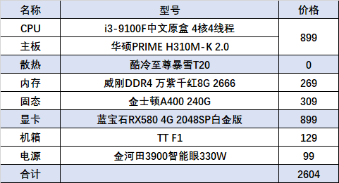 首先入门配置,CPU咱也别双核了,现在还去哪找双核,直接4核4线,3.6GHz,i3-9100F,上个最新的四代8G的2666频率的内存,稍微来点儿画质,蓝宝石的RX580 4G白金版显卡。