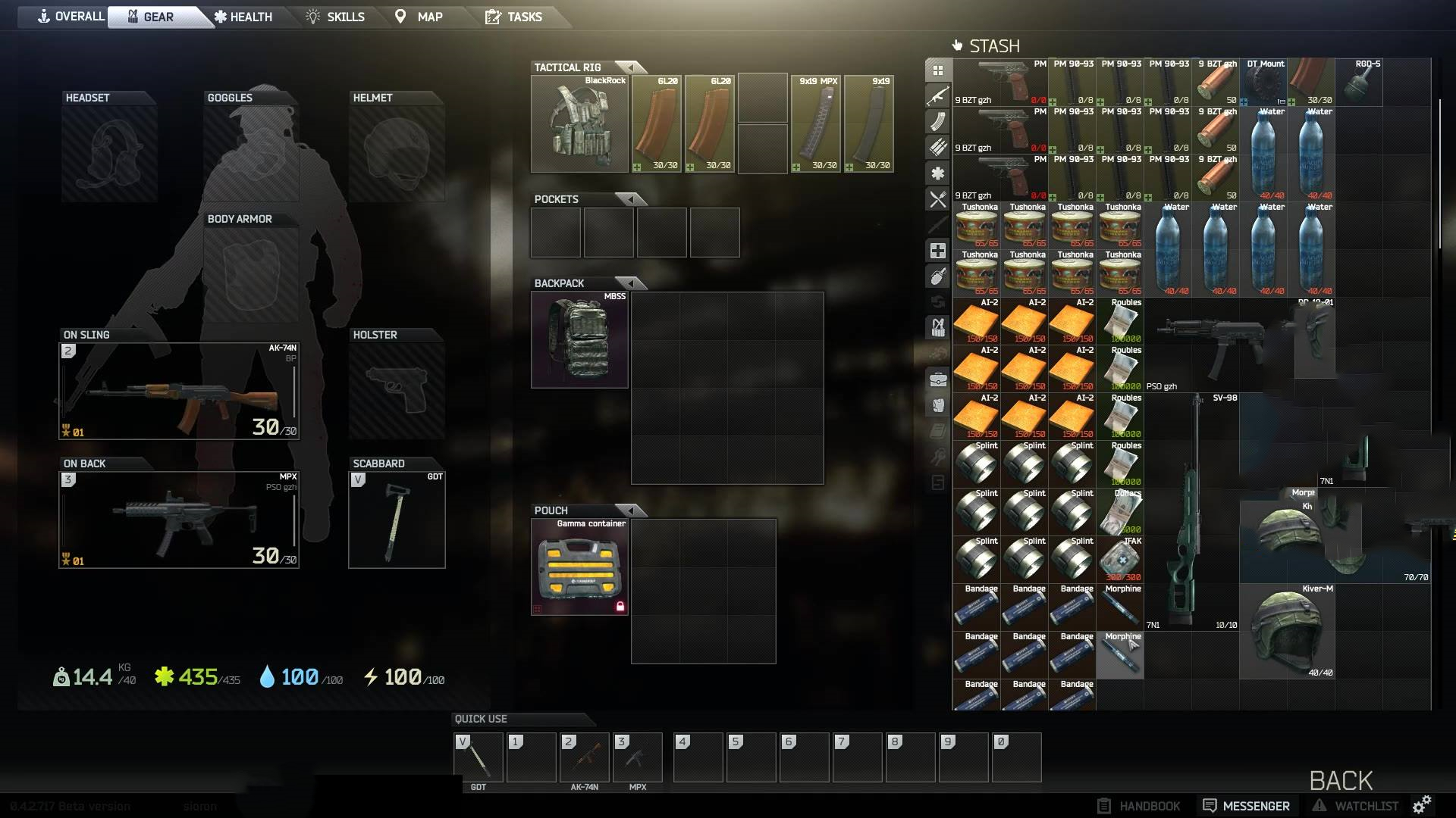 有些坑萌新的小伙伴会推荐你带着重型护甲和武器去莽,我是强烈不安利大家这样做的,你莽赢了没什么,莽输了可就不好受了,瞬间血亏,再加上重型护甲和武器会降低人的移动速度,加速体力方面的消耗,反而是一种得不偿失的事情,毕竟我们下图的目的是搜装备赚钱。