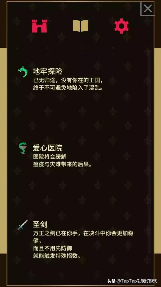 在游戏中你将扮演一位城堡中的国王,通过左右滑动卡片的操作来控制国家的命运,而这样一款画风简约,左比右划的简单操作方式,却让玩过这款游戏的玩家一点都不能抗拒它。
