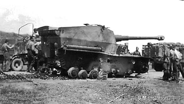 触雷受损后被装载在平板车上并准备运回德国本土克虏伯工厂的幸存“大麦克斯”,留意其缺少了一个右侧负
