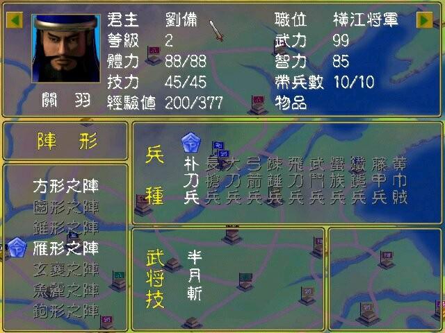 队伍的可选阵型很多,不过一般无视,一般策略就是两头并进,然后合路包围。要说武将在前期是比较一般的,经常被几个小兵就收拾,只有后期才变态,特别是带强力武将计的,最喜欢小兵围上来。