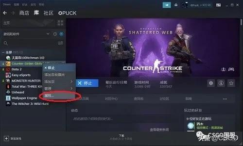 在steam页面右键点击CS:GO,选择属性。
