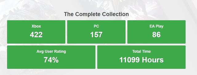 除了游玩时长,据网站统计信息,目前XGP库中Xbox主机平台包含422款游戏,PC游戏库中有157款游戏以及EA Play会员的86款游戏,XGP游戏库中游戏综合评价为74%。