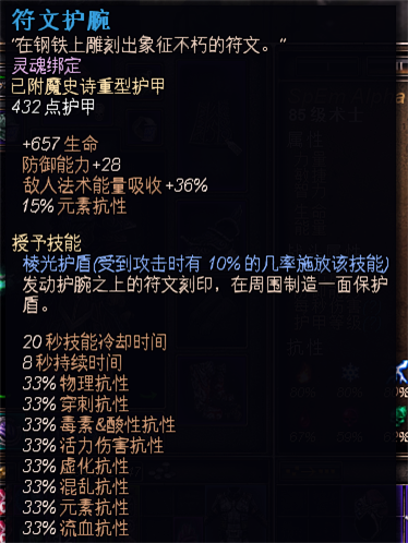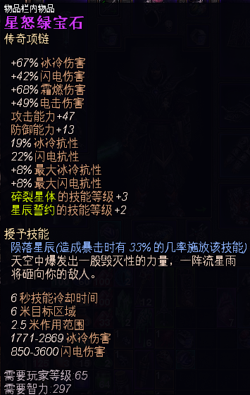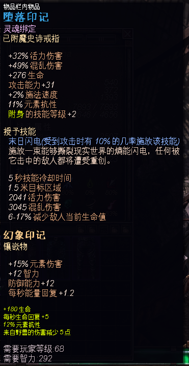 正如之上所言初步成型的难度要求是极低的,因为这套BD的主要方向是技能和星座,对于装备并没有绝对的依赖,所以装备选择的宽度比较广。从BD特征而言,选择装备的属性更应该是偏重于虚化,和元素伤害这两个范围内。其次以抗性,OA,DA,生命值,或落体触发技能装备为辅助。