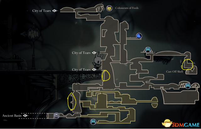 如图,小姐姐没记错的话在右边的圆圈里打 然后去下面的cast-off shell成为新一任国王,地图商人不确定是左边第一个还是第二个圆圈,总之在左侧石块垒起来的墙壁一个探出来的管子里。二眼the teacher就在迷雾峡谷的teacher's archive里,需要暗影冲刺才能过去。所以说你现在目标就是先去地图商人那买到地图 然后去打败小姐姐,去ancient basin最下方来到the abyss拿到暗影冲刺再回去补进度。