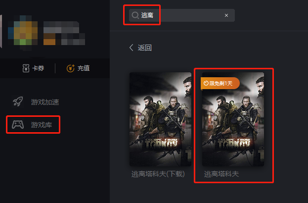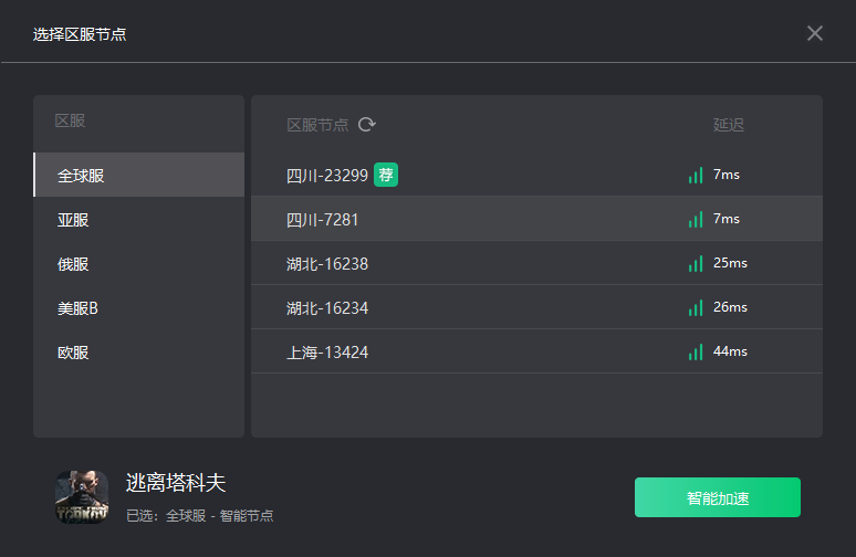 安装好工具软件后,在【游戏库】中搜索“逃离”即可找到游戏,双击后按照自己想要进入的区服选择加速节点。