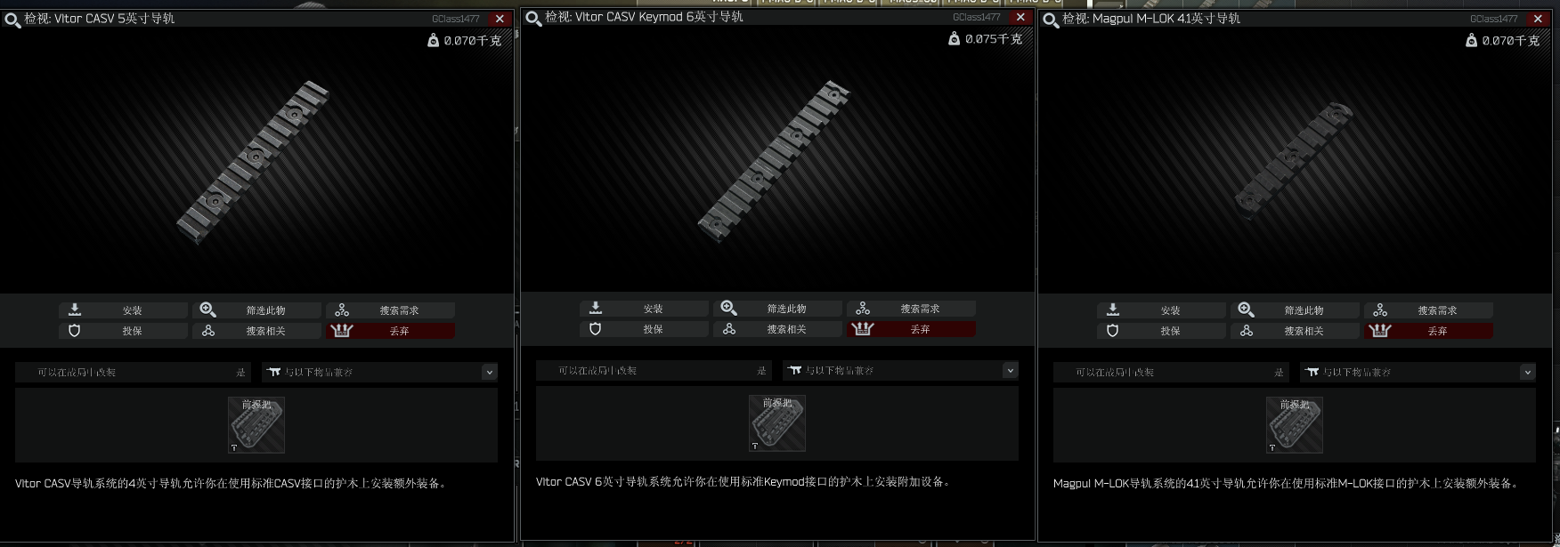 有萌新会问:“哎呀呀,我怎么买了握把装不上去啊。”这个问题主要是枪械护木上没有自带导轨的原因。我们需要以下几款通用导轨(当然有些护木连导轨都不让装我也没办法)。