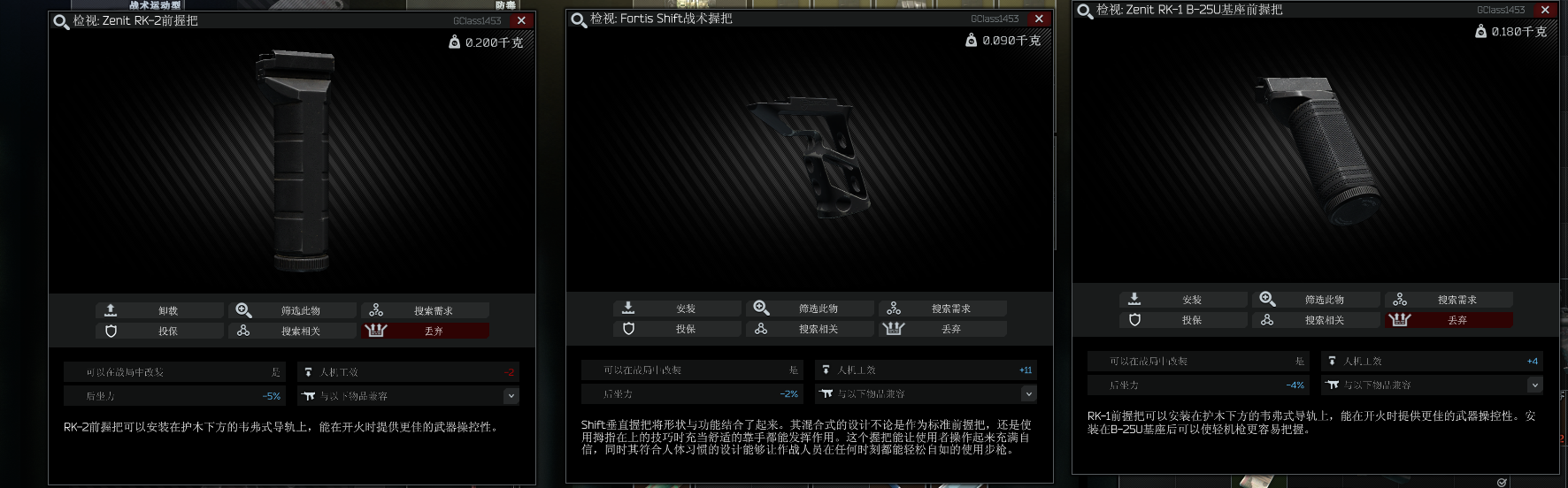 握把的属性排序为:优先降低后座,优先提高人机功效,各项均衡