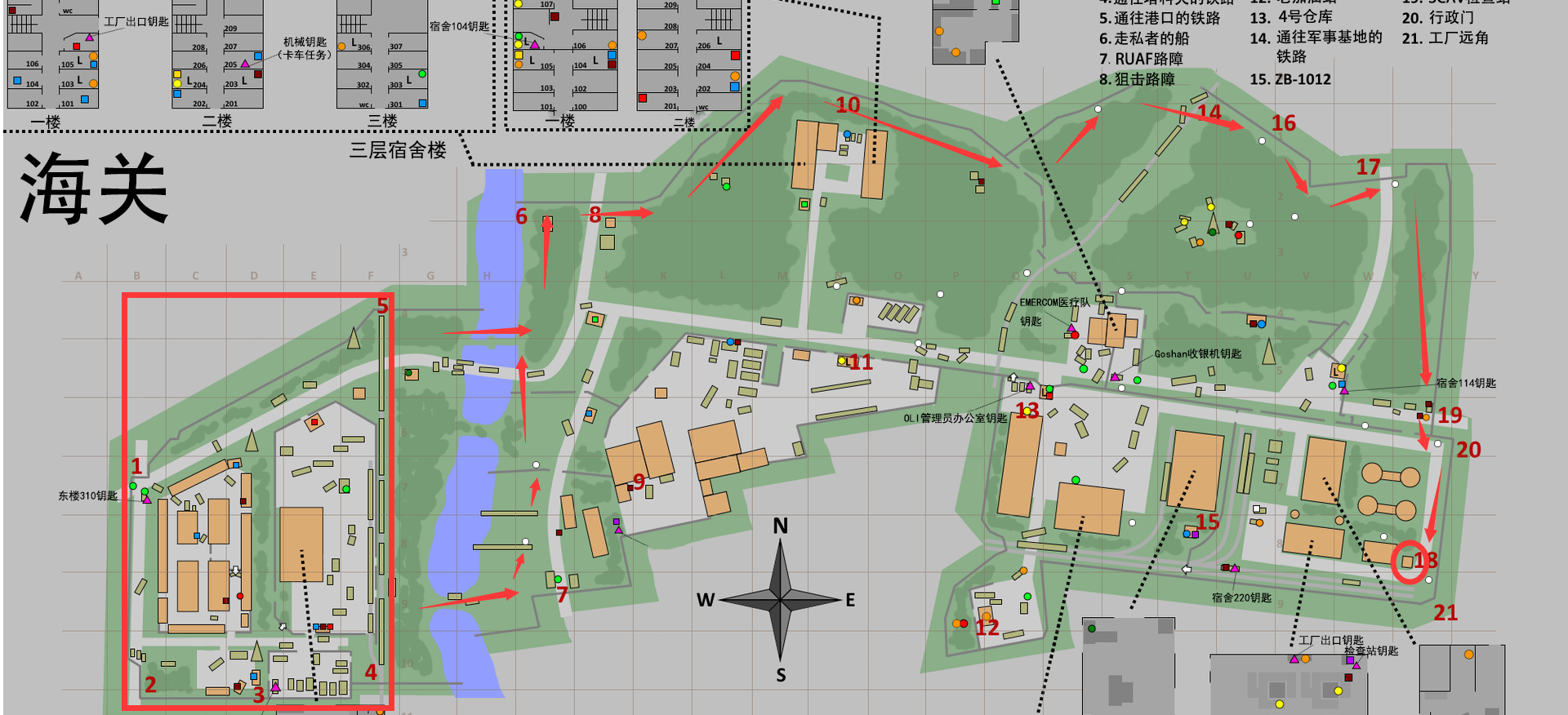 为什么是海关?海关是所有任务的开始,我觉得这也暗含着官方的提示:海关是最适合新手最好跑的图。我最开始是不知道这游戏还有任务的,看这么多的图也不知道跑哪个,就去 Wiki 找了一下地图,发现我能看懂的只有海关......打了一段时间之后就会发现,海关是一个很综合的地图。1. 资源点很分散,而且很多在复活点附近,很容易就可以填满裤裆(保险箱),至少不亏,甚至血赚。2. 标志性建筑多,不容易迷路。3. 楼少,除了两个宿舍楼,和工厂内的部分高台,你只需要关注地平线上的目标。4. SCAV 易于击杀(男团除外),就算打不过,跑起来也容易。