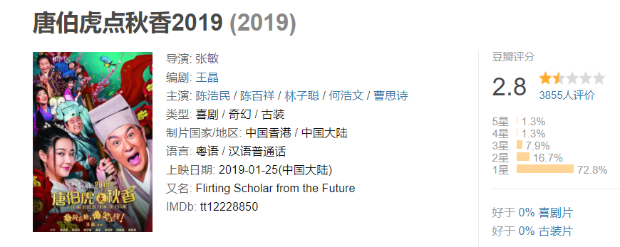 但万万没想到,内容、演员、制作三方面都有优势,新《唐伯虎点秋香》只拿到了2.8分,打一星的人数比例多达72.8%。很显然,这部新片翻车了,那么为何它的状况会如此惨呢?