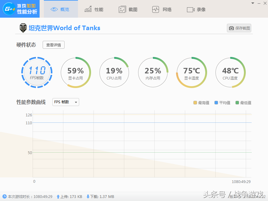 可以看到,高频E5和小影霸1070Ti外加16G内存完全足以让坦克世界这款游戏在1920分辨率+特效全开情况下稳定110帧。