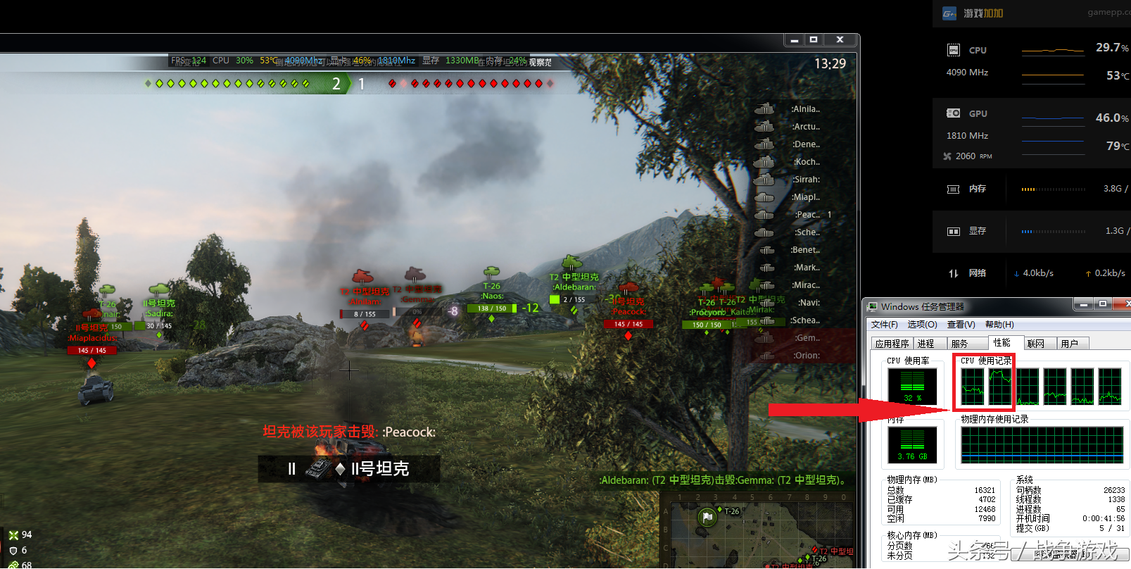 在激烈的战斗中,我们看到只有1个CPU内核是满载状态,另外一个核心半负载,姑且算是1.5核运行吧,那么我们选择4核心高频CPU就能满足游戏和系统后台程序处理的要求了。推荐的4核CPU有: