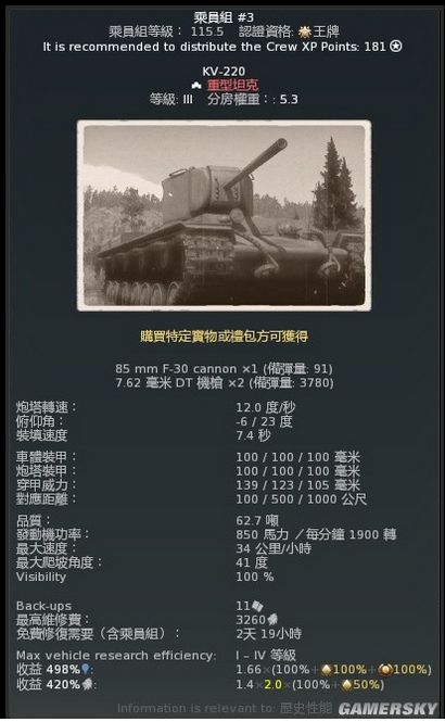 5.3的分房,意味着KV-220不会和IS-1一样遇到虎王和T29,12度/秒的炮塔转速符合KV系列重坦一贯风格,850马力柴油发动机带动62.7吨的坦克,直线加速能力不会很差,可以跟上T-34-85大队一起行动,不过因为是KV系列,转向能力应该不会很好。
