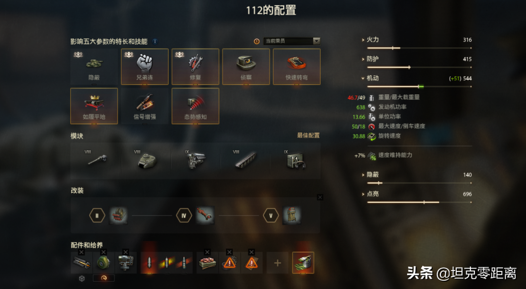 虽然112与它的老大哥WZ-111都被定性为突破型重坦,但是112远没有WZ-111来的丝滑,首先是112基础极速只有45,而且基础的单位功率也只有12.45,属于是一般的八级重坦水平,实战中也很难跑起来,所以我还是建议大家带一下涡轮,上涡轮后极速能达到50,单位功率能达到13.66,再配合战地改装的速度维持,112的驾驶体验会有不小的提升。