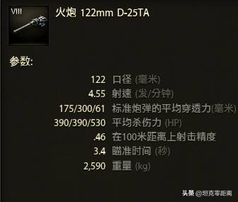 112作为一台传统的C系重坦,搭载了一杆C系祖传的D-25TA主炮,单发390的均伤在现在看来依然有不错的威慑力,近2300的DPM,2.83秒的瞄准时间以及.38的精度都属于是122mm炮的常规水准,加上0.23/0.23/0.12的三扩系数也比较差,所以这杆炮是一杆名副其实的血压炮,近战手感还好,但距离稍远,炮弹就开始经常做布朗运动了。